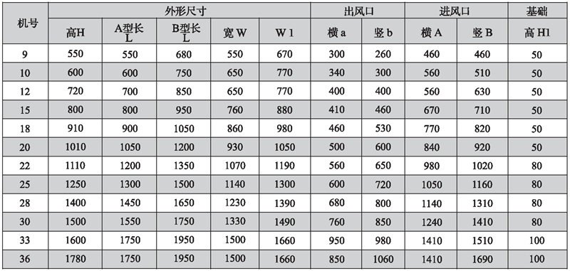 2.機號NO為葉輪直徑英寸數,如電機放在風機上面,A型高度須補加電機高度,寬度須補加皮帶罩寬度;如電機放在風機側面,A型寬度須補加電機長度。