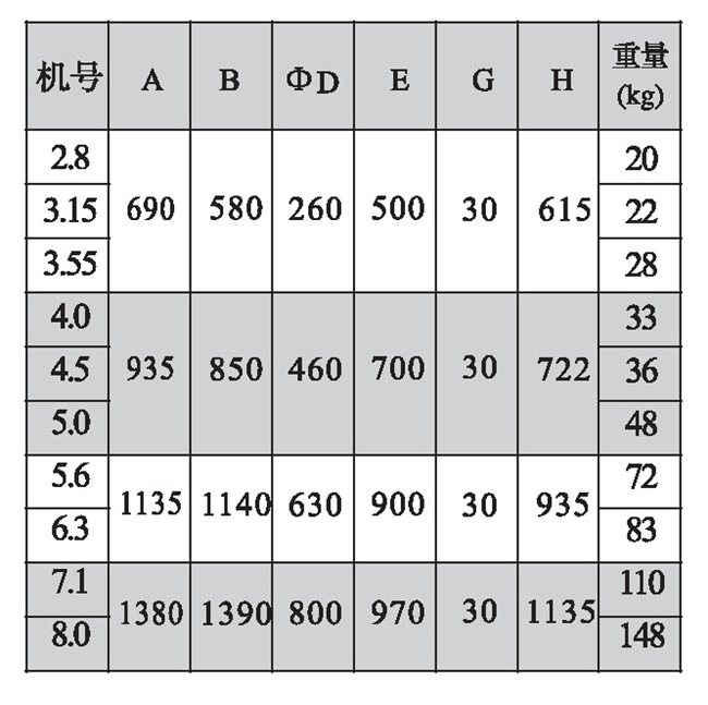 三、DWT-Ⅲ型風(fēng)機外形及基礎(chǔ)尺寸表(單位: mm)