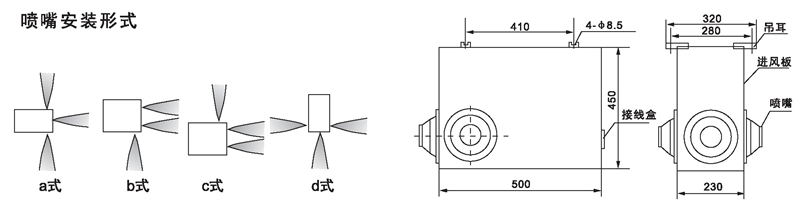 球形噴口臥式誘導風機由離心式通風機、消聲機箱。三個萬向球形噴嘴組成,回轉角度<60",噴口φ80X3。主要特點:調節靈活方使回轉角大,適用在多種環境安裝,外形美觀大方。