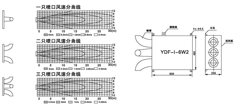 當末端風速為0.5m/8,X=10m時,風量為650m'/h- -臺誘導風機可誘導風量達至17560m3/h
